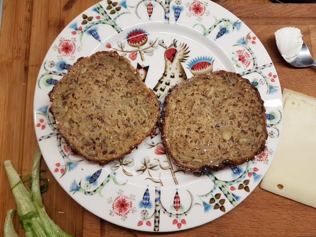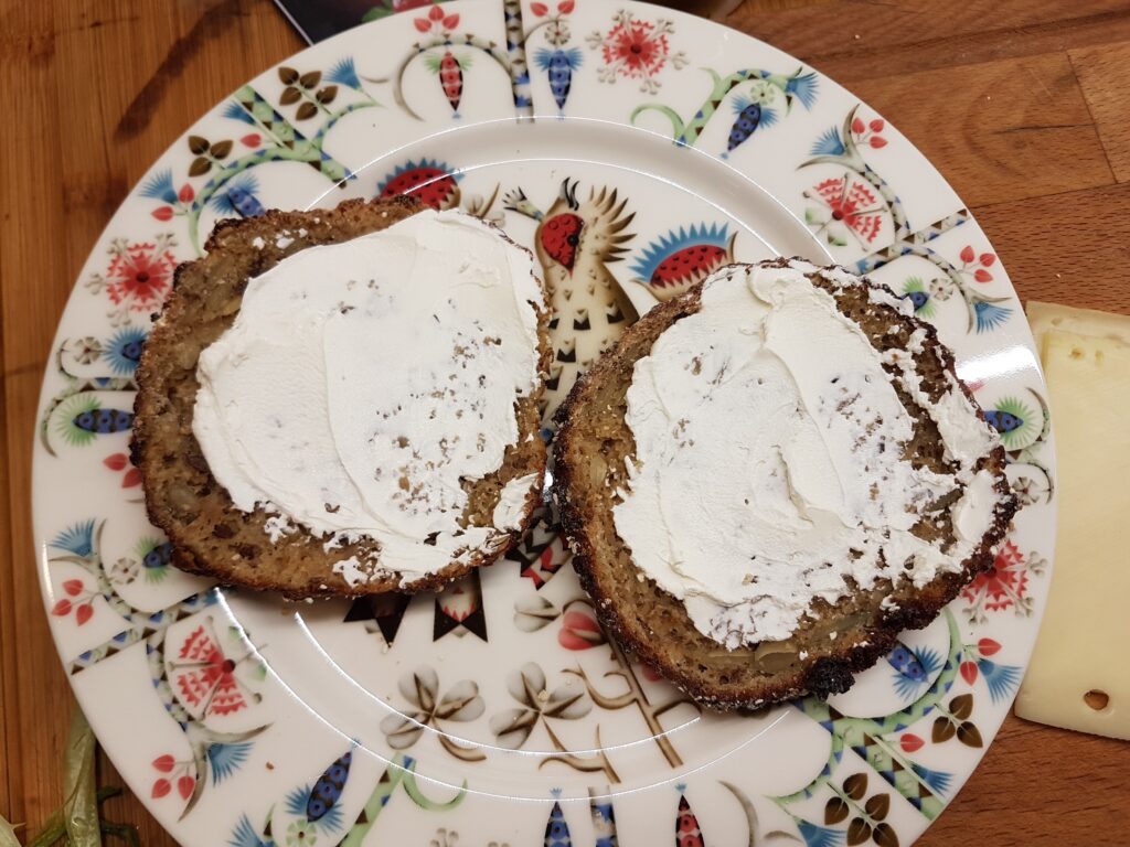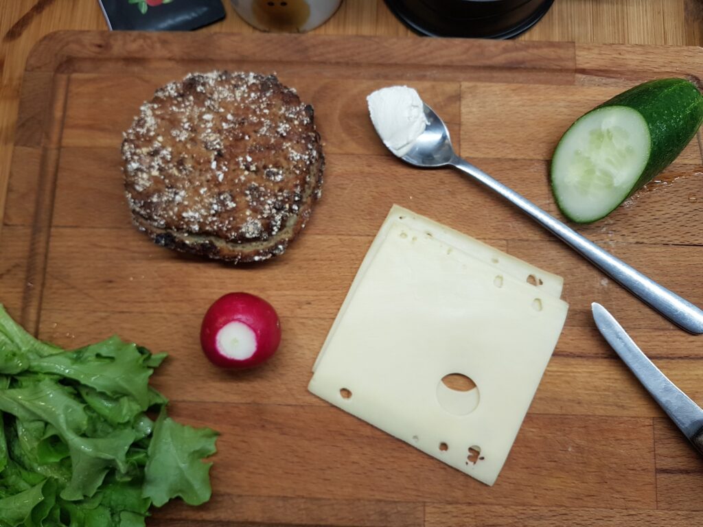 XII nädala teisipäevane hommikusöök on kaerakukkel toorjuustu ja köögiviljadega.
